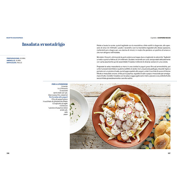 Ricette Svuotafrigo è il primo volume della collana “No stress in cucina”, per cucinare con meno fatica e molto più gusto. Questo volume raccoglie 90 ricette infallibili dall’antipasto al dolce. Anche pochi ingredienti o gli avanzi del proprio frigorifero possono trasformarsi in piatti gustosi ed equilibrati. Ricette Svuotafrigo invita a cucinare in modo pratico e consapevole, valorizzando ciò che già abbiamo in casa.